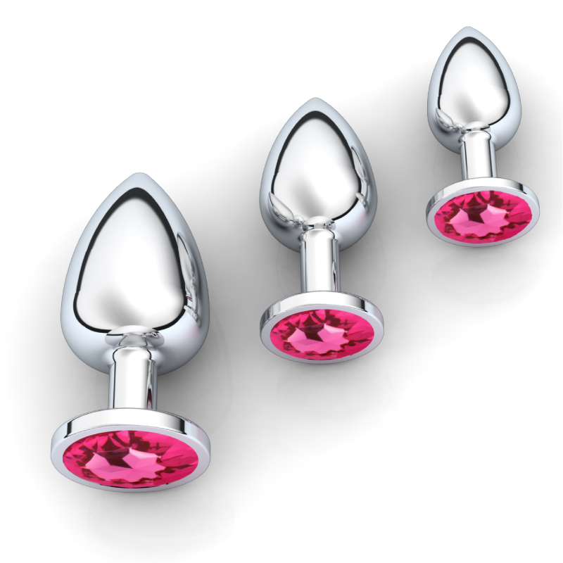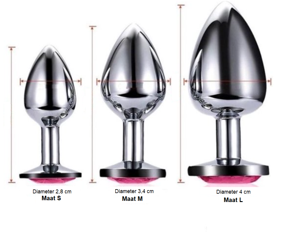 Kincky, zilverkleurige RVS but pluggen met roze diamant. Met dit speeltje bereik jij je ultieme hoogtepunt. De zilverkleurige buttplug heeft een prachtig roze diamantje aan de onderkant. De plug is perfect voor dames en/of heren die van elegant en stijlvol houden. Het gladde seksspeeltje heeft een rond middenstuk en een smalle hals. Als je de plug naar binnen schuift, dan kan ‘ie wat koud aanvoelen, wat ook wel weer fijn kan aanvoelen. Anders laat hem even opwarmen in heet water voor een extra fijn gevoel. De drie butpluggen zitten netjes in aparte suède zakjes om schade te voorkomen en zolang mogelijk te kunnen genieten van deze kincky speeltjes.